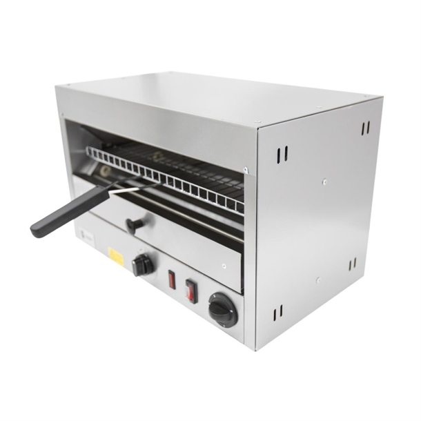 | Product Features | Dimensions 315(H) x 520(W) x 420(D)mm — Material Stainless steel — Output Up to 120 toasted sandwiches/36 x 6" pizzas/24 x 9" pizzas per hour — Supplier Model Number CAS — Warranty 2 Years Parts & Labour — Weight 15kg — Colour Stainless Steel — Free standing or wall mounted — Infra-red elements — Removable crumb tray — Automatic electronic timer — toast rackAnd grill pan include — Independently operated top elements — Up to 6 toasted sandwichesAtA time in 3 minutes |