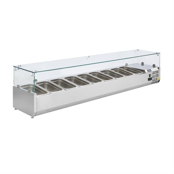 | Product Features | Capacity 9x 1/3 GN — Dimensions 435(H) x 2000(W) x 395(D)mm — Dimensions – insulation 40mm — Output 230W. 1.6A. — Refrigerant R600a / GWP 3 — Temperature Range 2°C to 8°C — Voltage 230V — Warranty 2 Years Parts & Labour — Weight 79kg — Colour Stainless Steel — Generous capacity – 9x 1/3 GN (GN pans sold separately) — Sturdy feet allow easy positioning — Manual defrost mode — Continual evaporator prevents water build-up — Some assembly required (glass) — Ambient temperature range: 10°C to 32°C — Time saving easy-clean construction — User-friendly digital temperature controls and display — Glass sneeze screen surround for improved hygiene |